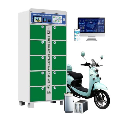 Each cabinet is installed with a solar panel and comes with a built-in inverter for renewable battery charging.